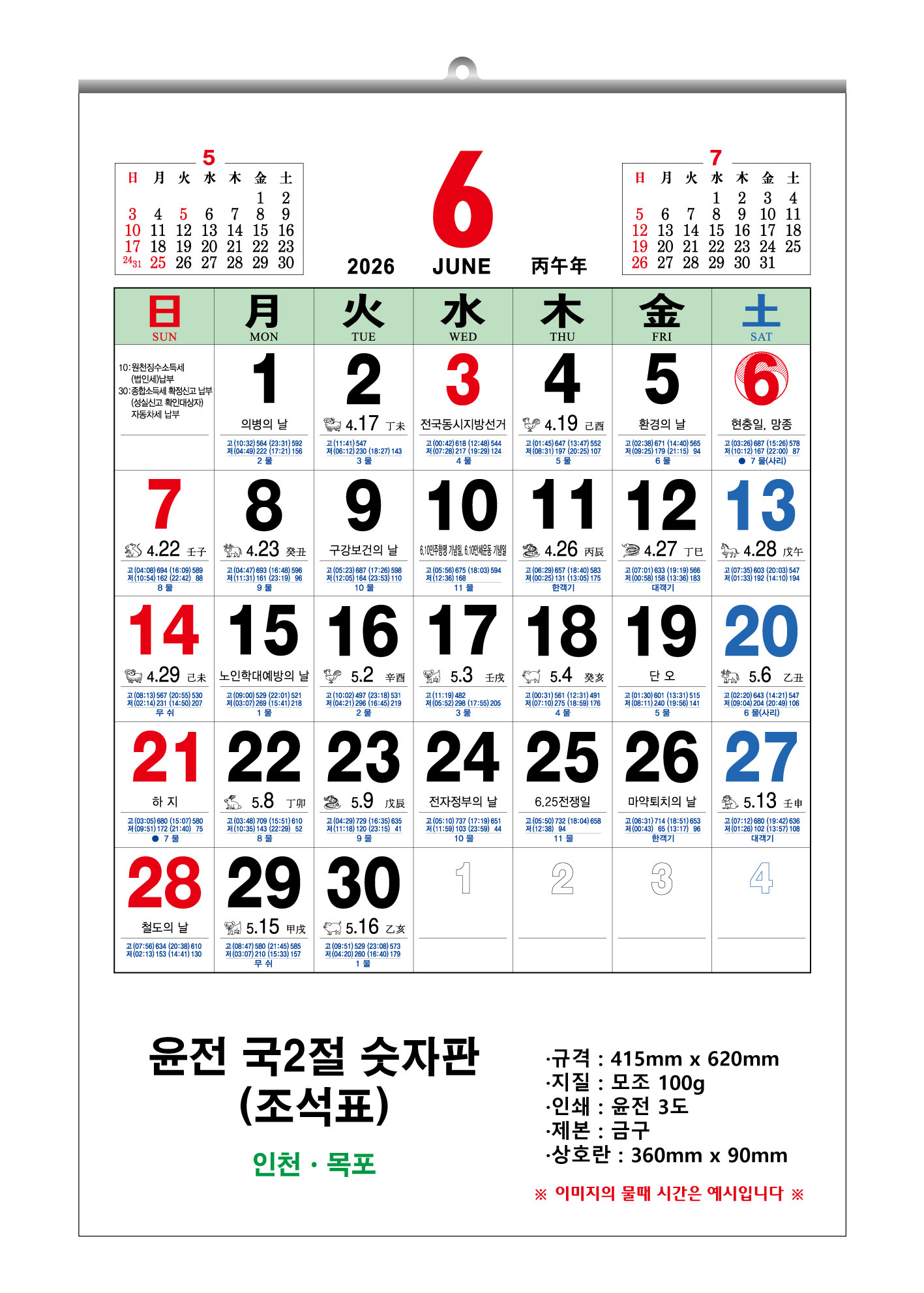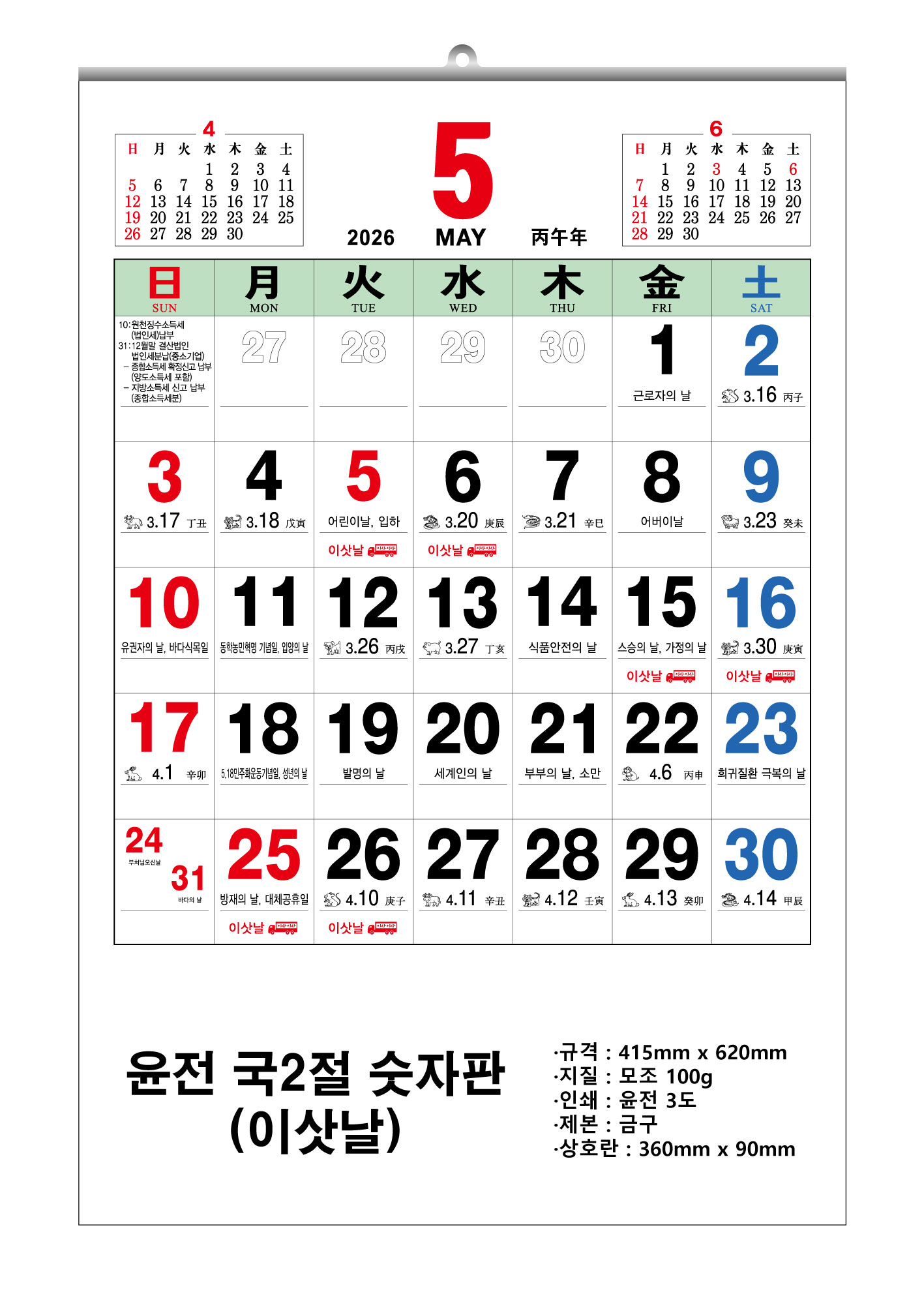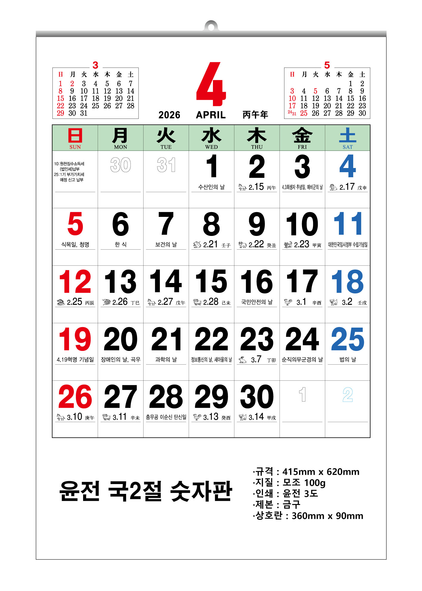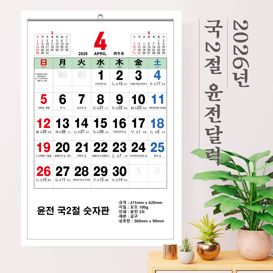 2026³â À±Àü 2Àý ¼ýÀÚÆÇ ´Þ·Â 495x720mm (70g / 100g)